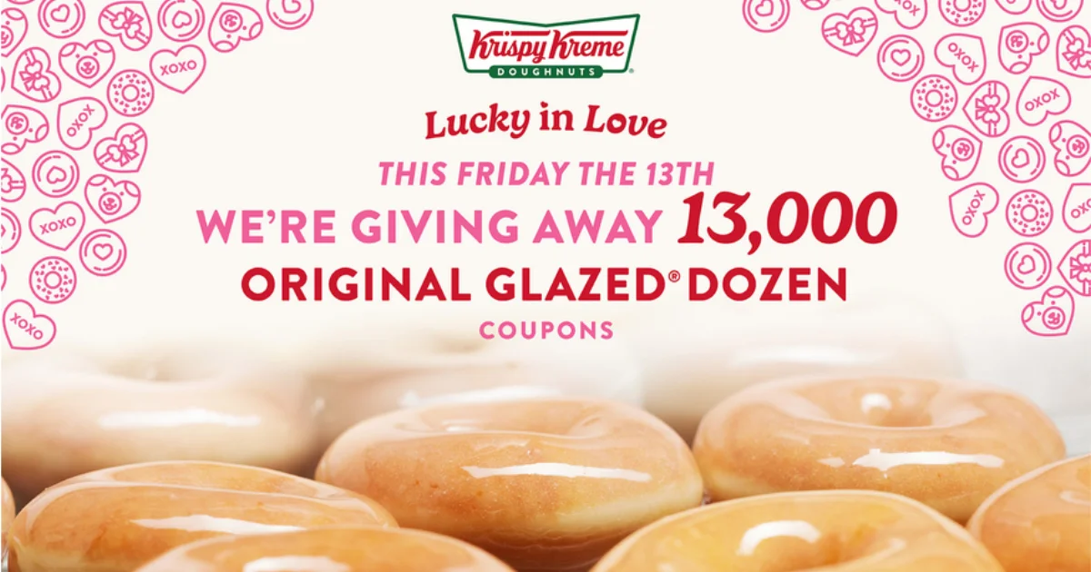 On February 13th, you can score a FREE Dozen Original Glazed Donuts at Krispy Kreme. Krispy Kreme on Friday will give away 13,000 FREE Original Glazed dozens to randomly selected guests at participating shops throughout the day.
