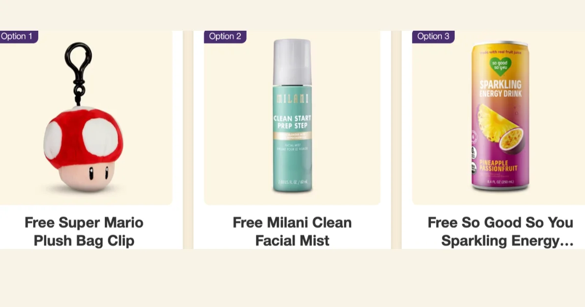 Through March 31st, Target Circle 360 Members can get a FREE Super Mario Plush Bag Clip, FREE Milani Clean Facial Mist, FREE So Good, So You Energy Drink, $5 off Select Vinyl’s or $5 off up&up diapers! Add it to your cart & the discount is automatically applied if you're a Target Circle 360 member.