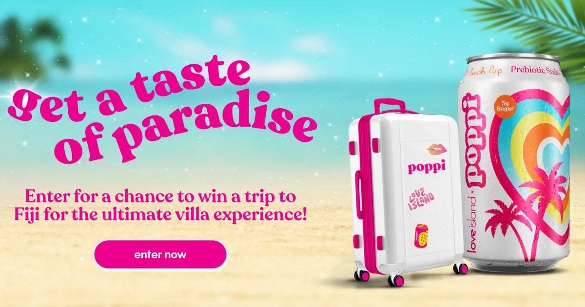 Enter to Poppi x Love Island Instant Win Game for a chance to win 7-Night Trip for Two to Fiji Including Roundtrip Coach Airfare. (200) Instant winners will each receive a Peacock TV 60-day subscription, (200) Instant winners will each receive a $50 Love Island merchandise promo code.